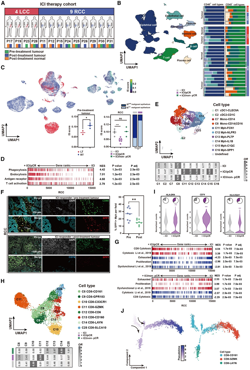 (A)结肠癌患者的治疗相关信息。(B)所有样本中广泛细胞类型的 UMAP 图(左)。细胞聚类频率显示为每个样本中总细胞的比例(右)。(C) UMAP 图按颜色显示恶性上皮起源,以及恶性上皮中 IS 评分的表达。(D) 所有巨噬细胞中基因集的 GSEA 富集比较。(E) 髓系细胞的 UMAP 图和热图显示每组中出现的细胞亚群的 OR。(F) mIHC 染色的代表性图像。(G) 所有 CD8 + T 细胞中基因集的 GSEA 富集。(H) CD8 + T 细胞的 UMAP 图和热图显示每组中出现的细胞亚群的 OR。(I)scRNA-seq 数据集中HLA-DRA、CD74和HLA-DQA1的表达。(J) RT 样本中CD8+ T 细胞聚类的伪时间排序分析。