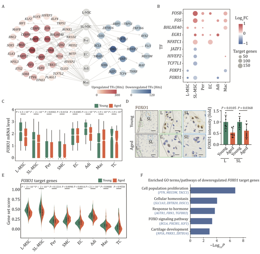 (A) 网络图显示人类滑膜老化过程中所有细胞类型中上调和下调的核心 TF。(B) 点图显示老化过程中不同细胞类型中核心 TF 的分布。 (C) 箱线图显示老化过程中不同细胞类型中FOXO1的表达水平。(D) 年轻和老年人类滑膜组织中 FOXO1 的 IHC 染色。(E) 小提琴图显示 FOXO1 靶标 DEG 在年轻和老年人类滑膜组织每种细胞类型中的基因集得分。(F) GO分析。