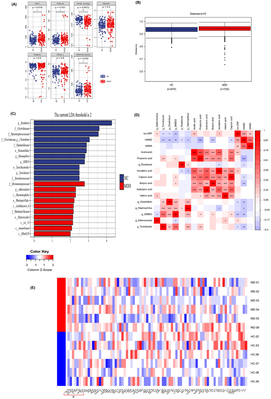 图1. MDD 患者的肠道微生物组成、短链脂肪酸 (SCFA) 和炎症指标。