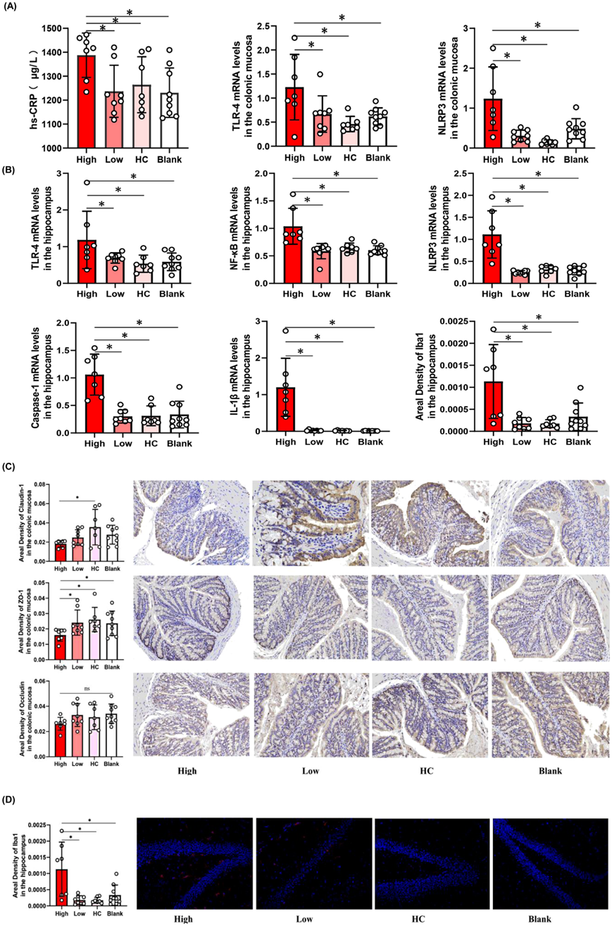 (a) 高炎性组肠黏膜TLR-4、NLRP3表达及血清hs-CRP浓度较低炎性组、HC组、空白组升高。(b) 高炎症组脑组织 TLR-4、NF-κB、NLRP3、Caspase-1表达及 Iba1密度 升高。 (c) ELISA 和免疫组化分析。(d) 高炎症组海马小胶质细胞数量和分支增多。