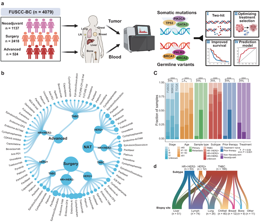 图1. FUSCC-BC 队列中研究患者和前瞻性测序样本的流程示意图和临床特征。