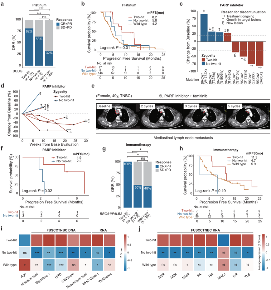 FUTURE试验(NCT03805399)是一项针对难治性转移性TNBC患者的Ib/II期、开放标签、多中心伞式研究。在这项试验中,具有gBRCA变异的基底样免疫抑制亚型患者给予PARPi治疗。同样,参与MULAN试验(NCT04355858)的gbrca阳性患者也接受了PARPi。MULAN试验是一项针对HR+/HER2-内分泌抵抗晚期乳腺癌患者的前瞻性、单中心、开放标签、伞形II期临床研究。在这些患者中,四名患者(80%)在第一次基线后评估时达到了客观缓解,而三名单等位基因病例经历了疾病进展(图6c-d)。值得注意的是,一名患有纵隔淋巴结转移的 TNBC 患者,其种系BRCA1突变经过两击失活,在接受 PARPi 和法米替尼五线治疗后表现出完全缓解(图6e)。此外,用 PARPi 治疗的双等位基因BRCA1/2突变携带者比单等位基因携带者具有更好的 PFS 益处(图6f)。