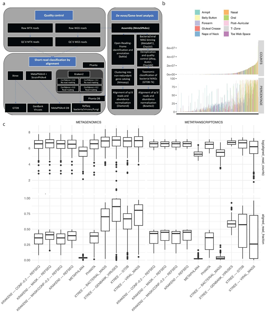 i4 机组人员收集了涵盖八个时间点的微生物组数据集:飞行前三个,飞行后三个,飞行期间两个。总共,对 385 个宏基因组拭子和 365 个宏转录组拭子进行了测序,包括代表口腔、鼻腔和皮肤微生物组的十个身体部位以及八个粪便样本(图1a)。他们使用了多种短读比对和从头组装方法来估计本研究数据集的微生物群落分类和功能组成(图S1)。通过线性混合效应 (LME) 建模方法,他们进行了微生物组关联研究 (MAS),计算每个分类等级和分类器与飞行与(1)细菌种类、(2)病毒属和非冗余蛋白质的丰度之间的关联。将错误发现率 (FDR) 显著特征分为四类:飞行中暂时增加、飞行中暂时减少、飞行中/后持续增加和飞行中/后持续减少。他们还拟合了广义线性模型 (GLM) 和 LME,并发现这两种方法总体上是一致的。