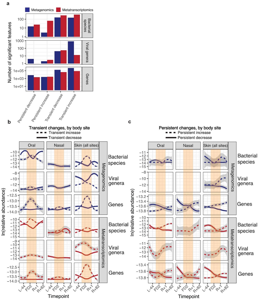 不同的身体部位显示出不同的时间趋势,这些趋势因分子类型(基因表达与相对丰度)和生命领域的不同而有所不同。所有身体部位都出现了随时间而变化的趋势。口腔微生物组显示出相对丰度和细菌基因表达的重组;161 种细菌和病毒分类法暂时增加,173 种暂时减少,62 种持续增加,12 种持续减少(图1c)。