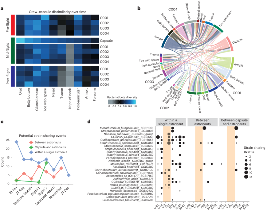 (a) 细菌宏基因组学的 Beta 多样性。(b) 飞行中途时间点期间机组人员和太空舱之间的菌株共有事件。 (c) 随时间推移的菌株共有事件数量,其中事件定义为在两个不同的拭子位置之间检测到相同的菌株。(d) 在给定时间点内检测到至少两次菌株共有事件的生物体。
