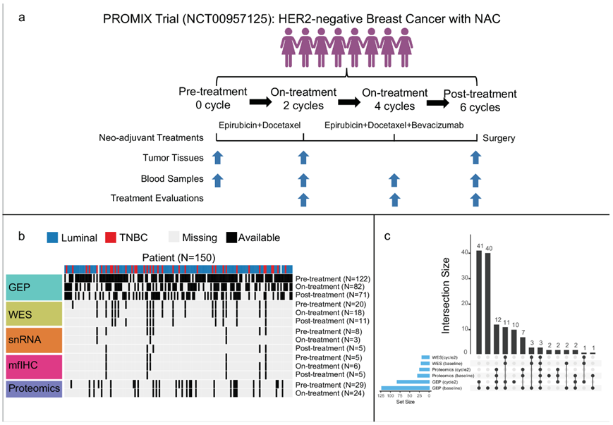 (a) 研究设计和多组学数据收集概述。 (b) 热图显示来自 PROMIX 试验的纵向深入蛋白质组学、转录组学、遗传学和 mfIHC分析。(c) UpSet图显示多组学数据交叉。