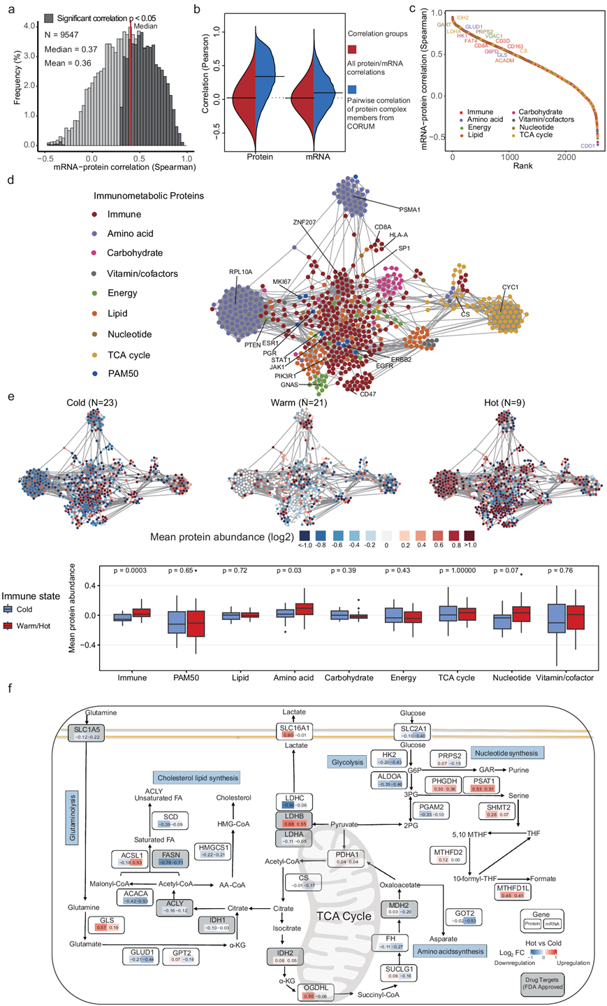 (a) 单个基因的蛋白质和 mRNA之间的相关性。(b) 使用53 个肿瘤的定量蛋白质和 RNA 水平,将所有成对相关性与来自 CORUM 数据库的已知相互作用对的相关性进行比较。(c) mRNA-蛋白质相关性。(d) 基于免疫代谢和 PAM50 蛋白的乳腺癌蛋白质相关网络。(e) 相关网络中三种免疫亚型/状态的平均蛋白质组定量的可视化。箱线图显示冷和温/热肿瘤之间每个模块平均蛋白质丰度的差异。(f) 通路图总结了参与 TCA 循环、糖酵解、核苷酸、氨基酸和胆固醇脂质合成与代谢的代谢基因。