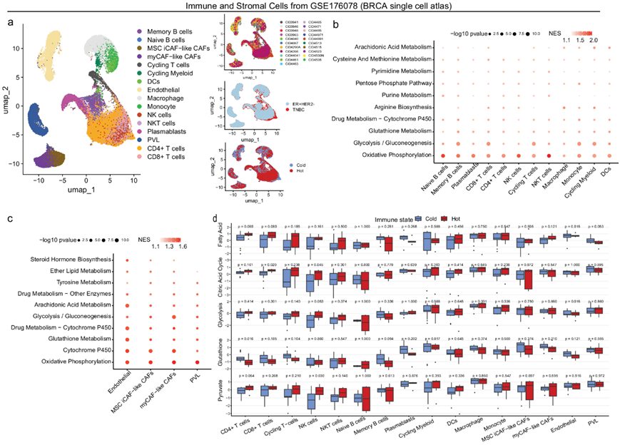 (a) UMAP图显示乳腺癌单细胞图谱 (GSE176078) 中 HER2 阴性子集的免疫和基质细胞。(b-c) 代谢通路富集对免疫细胞和基质细胞之间代谢异质性贡献最大的基因。(d) 比较了冷和热肿瘤中免疫和基质细胞的代表性代谢通路得分 。