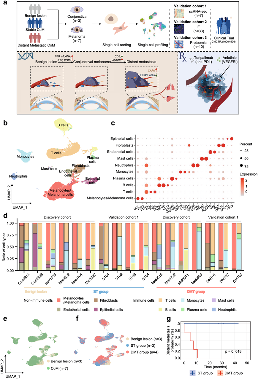 (a) 实验策略示意图。(b) UMAP图显示了 CoM 和非恶性结膜组织中不同细胞类型的注释。(c) 点图显示不同细胞类型中特定细胞标记基因的表达水平。(d) 条形图表示注释细胞类型的比例。 (e-f) UMAP 图按颜色显示细胞起源。(g) scRNA -seq 队列中 ST(蓝色)和 DMT(红色)组的 CoM 患者基于远处转移的无进展生存期。