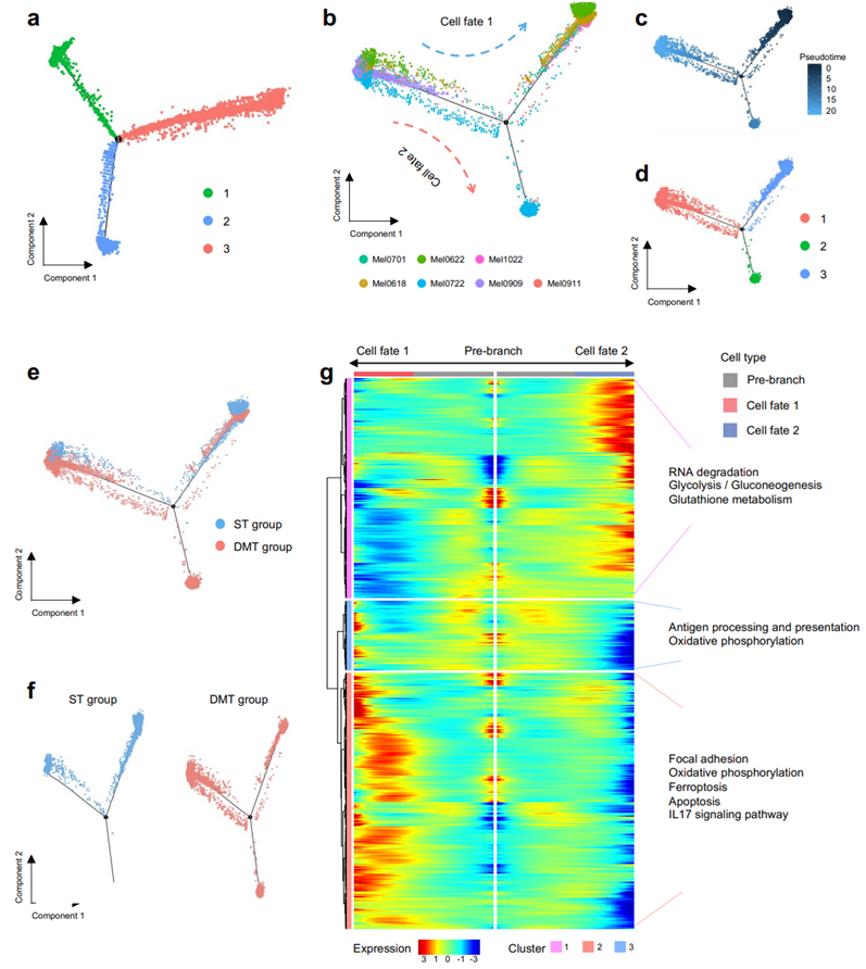(a) 不同过程的转录轨迹用聚类表示。(b) ST组和DMT组所有黑色素瘤细胞的伪时间状态。(c-f) 转录轨迹分析显示黑色素瘤细胞的不同过程。(g) 热图显示分化过程中基因的上调或下调。