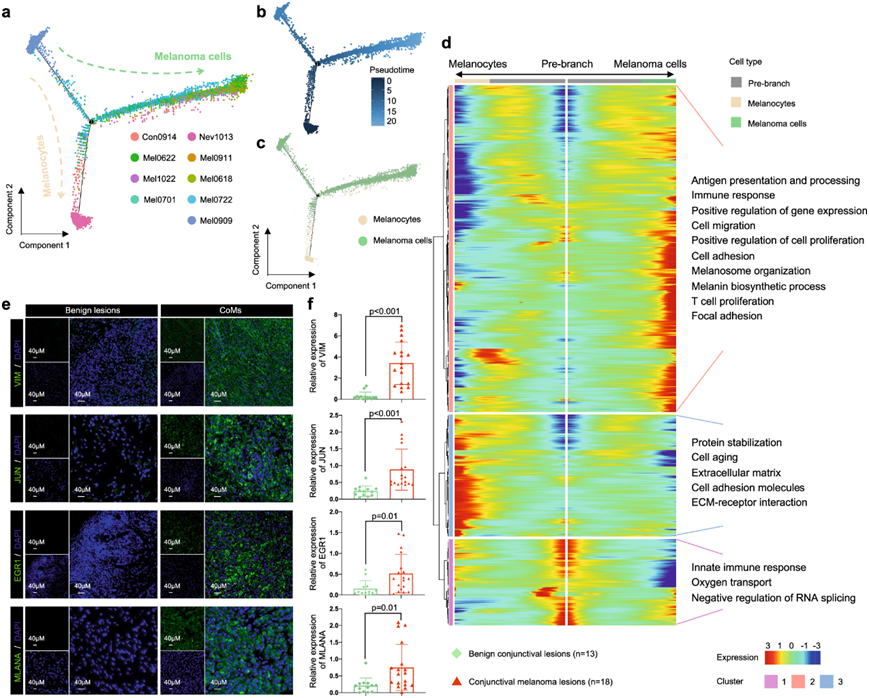 (a) 所有结膜样本中 3041 个黑色素细胞和 11964 个黑色素瘤细胞的转录轨迹分析。(b) 分化过程的转录轨迹。(c) 采用伪时间分析比较黑色素细胞和黑色素瘤细胞之间的分布。(d) 热图显示分化过程中上调或下调的基因。(e) 验证队列中 FFPE 组织中 IF 染色的代表性图像。(f) 基于IF 染色结果,验证队列中非恶性结膜病变(绿色)和 CoM 组织(红色)中 VIM、JUN、MLANA 和 EGR1 的平均表达。