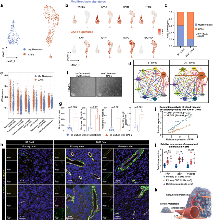 (a) UMAP 图显示源自 ST 和 DMT 患者的 CAF 亚型。(b) UMAP图说明肌成纤维细胞(TAGLN、MYL9、TPM1和TPM2)和 CAF(FAP、IL1R1、MMP2和PDGFRA)的标志基因表达。(c) 条形图显示 ST 和 DMT 样本中 CAF 和肌成纤维细胞的比例。(d) ST 和 DMT组中 CAF、血管内皮细胞、肿瘤和免疫微环境的通讯网络。(e) 肌成纤维细胞和 CAF 中血管生成 GSVA 评分的箱线图。(f-g) HUVEC 管形成试验显示肌成纤维细胞和CAF对 HUVEC 小管形成的影响。(h) ST组和 DMT 组的 FAP(CAF 标志物)、VEGFR 和 CD31 的 IF 染色。(i) 血管相关蛋白与 CoM 中的 FAP 的相关性分析。(j) 根据IF 染色的结果,原发性 ST CoM、原发性 DMT CoM 和远端转移部位中基质细胞标志的相对表达。(k) 示意图显示了它们通过增强血管生成在促进远处转移中的可能作用。