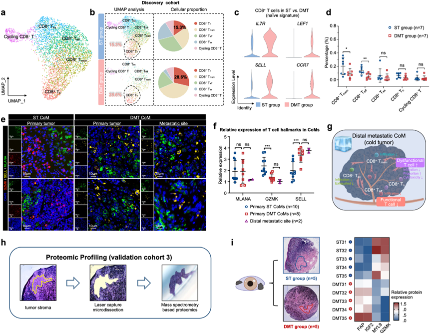 (a) UMAP 图显示所有 7 个 CoM 样本的 CD8 + T 细胞亚群,以不同颜色标记。(b) 分析了 ST 组和 DMT 组之间特定 CD8 + T 细胞亚群的比例(左)。饼图显示 ST 和 DMT 组中 CD8 + Tn细胞的比例(右)。 (c) 小提琴图显示ST 和 DMT 组中 CD8 + T 细胞幼稚特征的表达。(d) 分析了发现队列和验证队列 1 中 ST 组和 DMT 组之间特定 CD8 + T细胞亚群 的浸润百分比。 (e) IF 染色验证 ST 和 DMT 样本中免疫微环境的特征。(f) 根据IF 染色的结果,原发性 ST CoM、原发性 DMT CoM 和远端转移部位中 MLANA、GZMK 和 SELL 的相对表达。(g) 显示远处转移性 CoM 中CD8 + T 细胞变化的示意图。(h) 组织形态学特征。(i) ST组和 DMT 组之间的差异表达蛋白质。