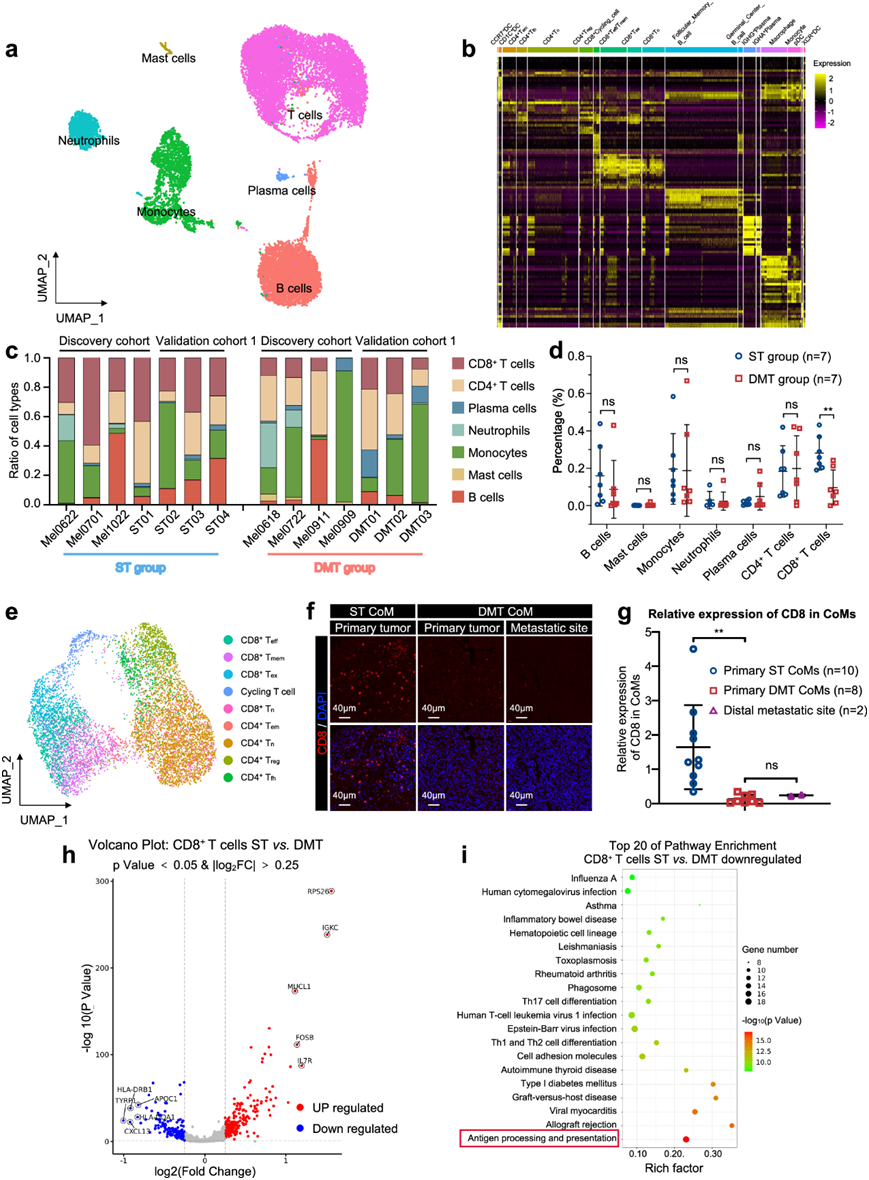 (a) UMAP 图显示 CoM 样本中的免疫细胞类型。(b) 热图显示每种免疫细胞亚型中标记基因的表达水平。(c) 条形图显示 ST 组的 7 个样本和 DMT 组的 7 个样本中注释细胞类型的比例。(d) 来自发现队列和验证队列 1 的 ST 组和 DMT 组中每种免疫细胞亚群的比例。(e) UMAP图显示发现队列中所有 7 个 CoM 样本的 T 细胞亚群。(f) 分别来自 ST 和 DMT 组的 CoM 组织切片和远端转移部位的 CD8 抗体 IF 染色。(g) 根据IF 染色的结果,原发性 ST CoM、原发性 DMT CoM 和远端转移部位中 CD8 的平均表达。(h) ST组和 DMT 组之间CD8 + T 细胞中差异表达基因的火山图。(i) ST 组和 DMT 组之间 CD8 + T 细胞中下调基因的气泡图富集通路。