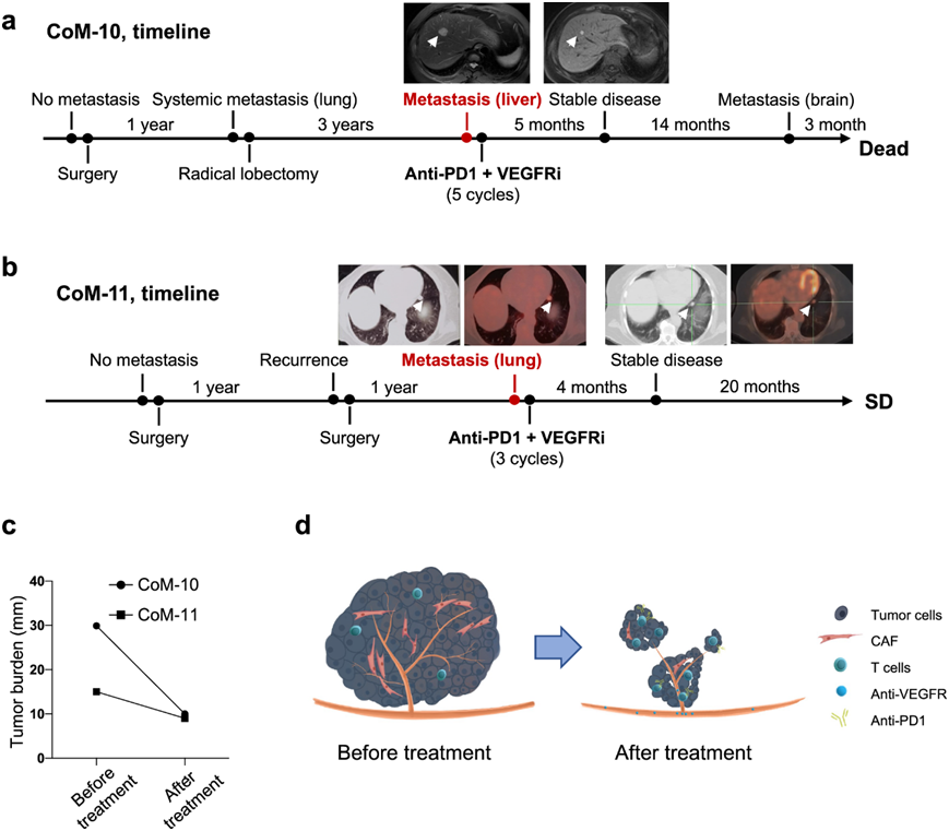 (a) 接受 VEGFR 阻断联合抗 PD1 疗法治疗的 CoM-10 患者放射学随时间的变化。 (b) 患者 CoM-11 的CoM进展和治疗图。(c) 患者肿瘤负荷随时间的变化。(d) 临床试验可能的潜在机制示意图。