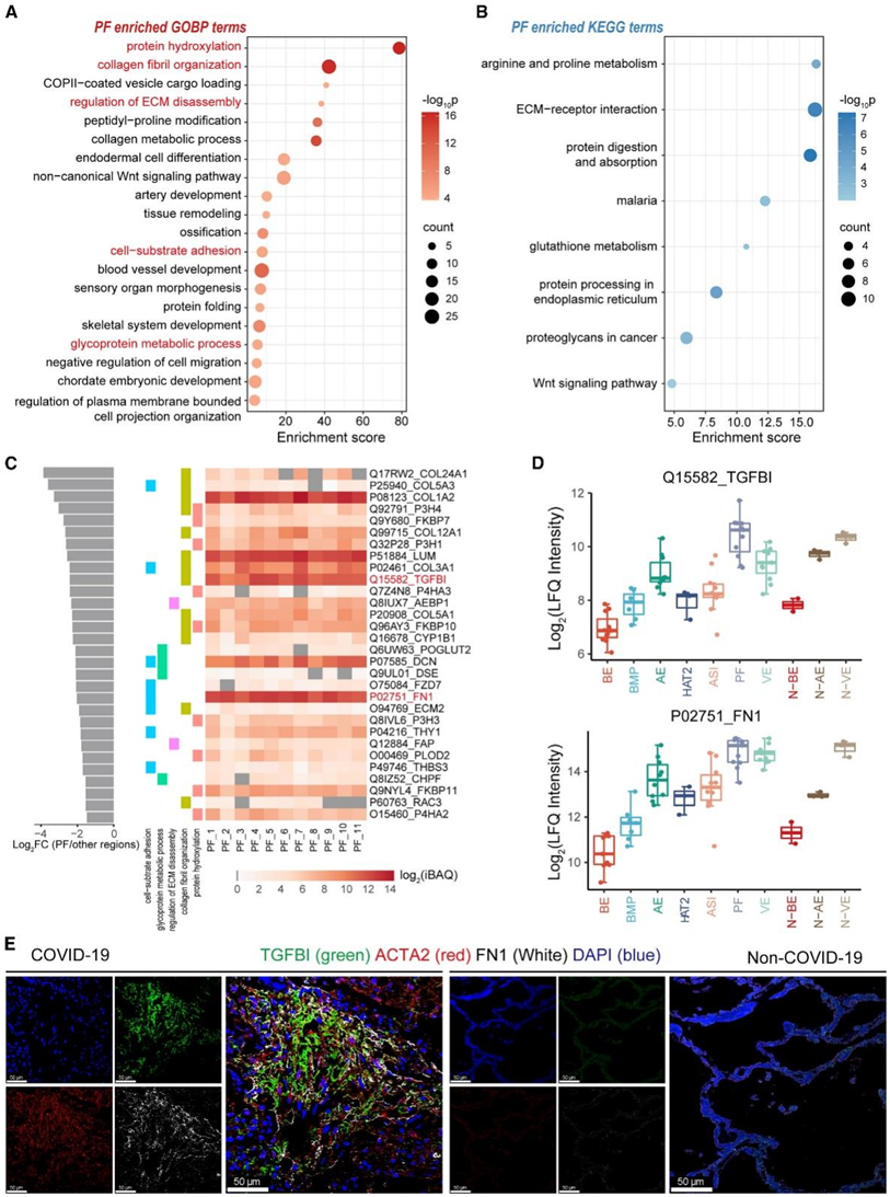 (A) 点图显示富含 PF 的蛋白质聚类的前 20 个重要 GOBP分析。(B) 点图显示 PF 富集蛋白聚类的所有显著 KEGG 通路。(C) 所选 GOBP 的蛋白质表达模式。(D) COVID-19 和非 COVID-19 肺部 10 个区域中 TGFBI 和 FN1 蛋白表达的箱线图。(E) COVID-19 PF 区域和非 COVID-19 肺泡区域中 TGFBI 和 FN1 的免疫荧光图像。