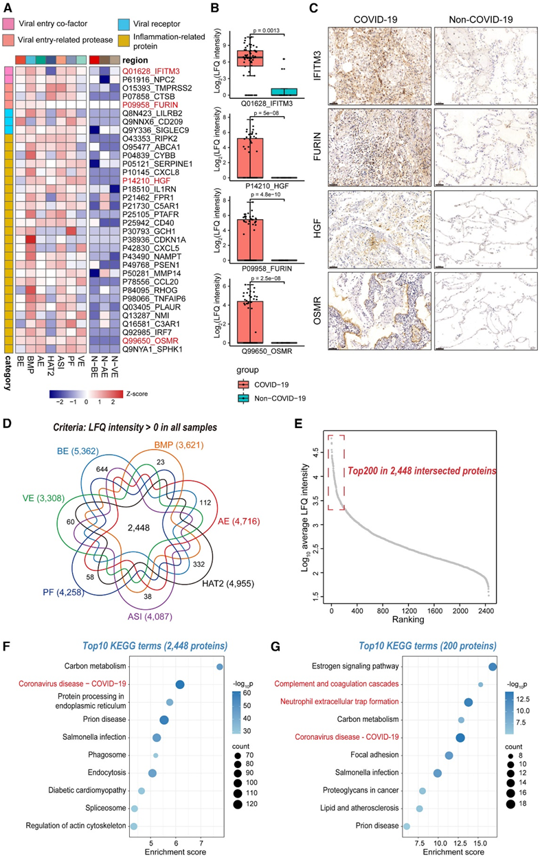 (A) 热图显示了涉及 COVID-19 和非 COVID-19 肺部 10 个区域的病毒进入、宿主限制和炎症反应的显著上调蛋白质的Z评分归一化强度。(B) 来自 COVID-19和非 COVID-19 肺部的所有样本中 IFITM3、HGF、FURIN 和 OSMR 蛋白表达的箱线图。(C) COVID-19 肺和非 COVID-19 肺中 IFITM3、HGF、FURIN 和 OSMR 的免疫组织化学图像。(D) 维恩图显示七个 COVID-19 区域的蛋白质组交叉点。(E) 散点图显示 2448 个交叉蛋白质的强度排名。(F-G) 点图显示显著 KEGG 通路。