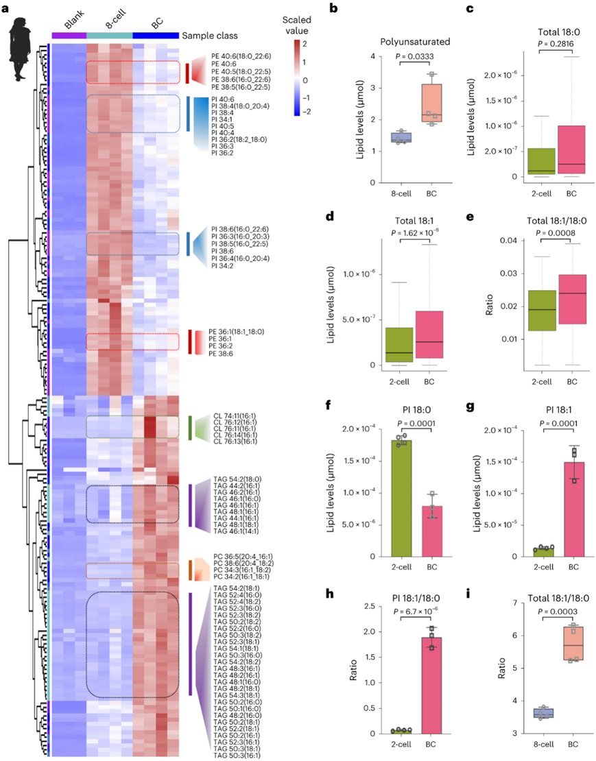 (a) 热图显示人类八细胞和胚泡胚胎中的脂质水平。 (b) 箱线图显示人八细胞和胚泡胚胎中总脂质中多不饱和脂质的水平总和。 (c-e) 箱线图显示硬脂酸 (C18:0)、油酸 (C18:1)的水平以及油酸/硬脂酸 (C18:1/C18:0) 的比例小鼠双细胞和囊胚期胚胎的总脂质。 (f-h) 条形图显示小鼠双细胞和囊胚阶段 PI 中C18:0、C18:1和 C18:1/C18:0的水平。 (i) 显示人类八细胞胚胎和囊胚胚胎的 C18:1/18:0 比率的箱线图。