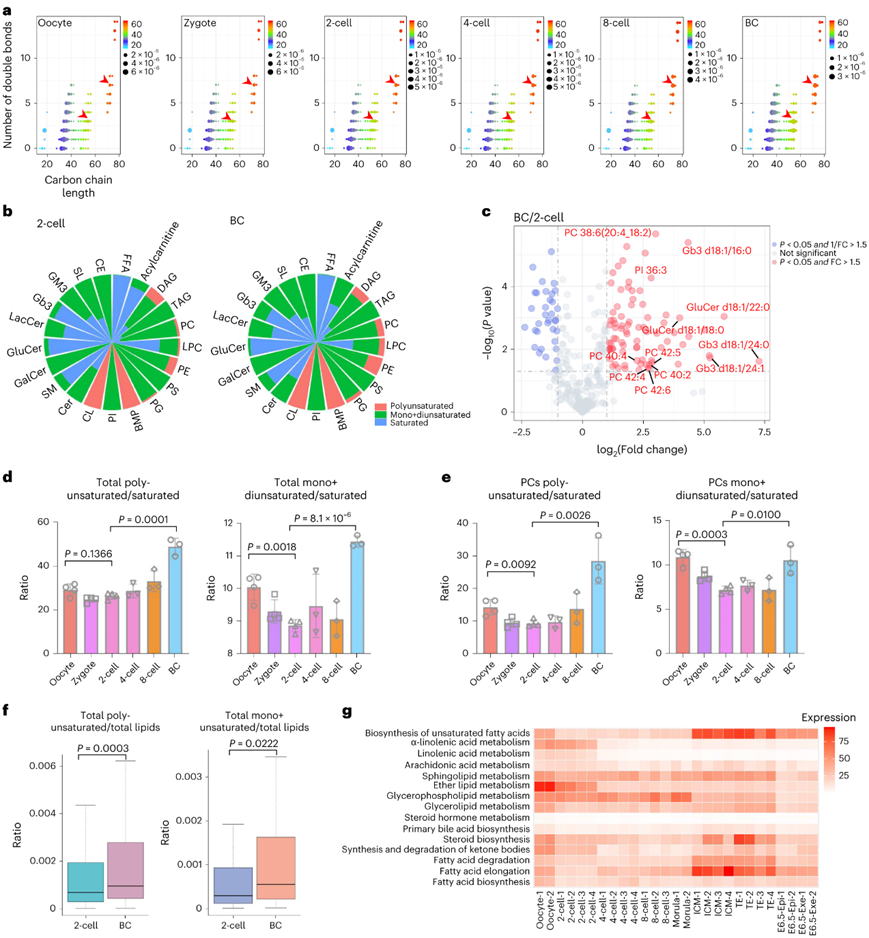(a) 气泡图显示小鼠植入前胚胎发育过程中总脂质谱中碳链长度和碳双键数量的变化。 (b) 南丁格尔玫瑰图,说明双细胞和囊胚胚胎中多不饱和、单+双不饱和和饱和脂质种类的浓度总和的分布。(c) 火山图,比较时脂质种类的显著变化。(d) 条形图显示在六个发育阶段中总多不饱和脂质与总饱和脂质以及总单+双不饱和脂质与总饱和脂质的浓度比率。(e) 条形图显示了在六个发育阶段中多不饱和PC与饱和PC以及单+双不饱和PC与饱和PC的浓度比率。 (f) 箱线图显示归一化为饱和加不饱和脂质浓度总和的每种多不饱和脂质种类的水平分布。 (g) 对公开的bulk RNA-seq数据和平均基因表达进行KEGG通路分析,显示了胚胎发育阶段脂质代谢通路的动态变化。