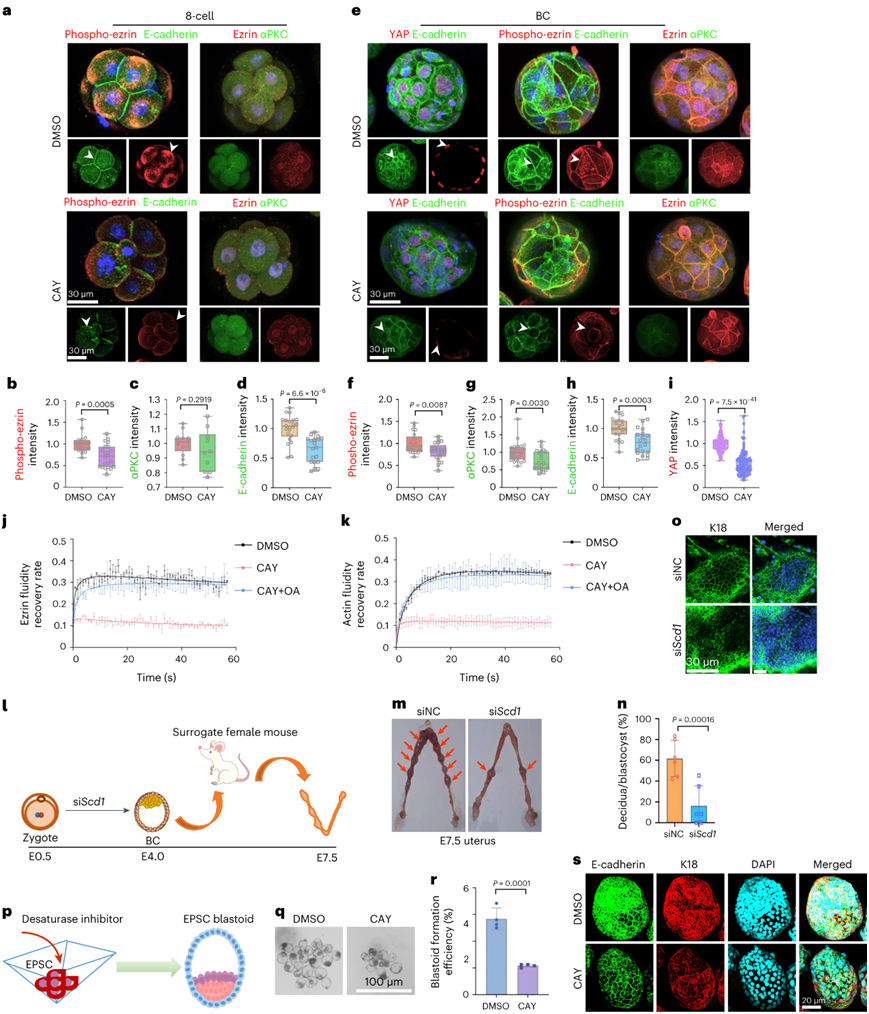(a)免疫荧光分析。 (b-d) 荧光强度定量。(e) E-钙粘蛋白、埃兹蛋白、αPKC、磷酸埃兹蛋白和 YAP 染色的免疫荧光显示它们在用 DMSO 或 CAY10566 处理的囊胚期胚胎中的定位。 (f-i) 荧光强度定量。(j-k) FRAP 分析显示用 DMSO 或 CAY10566 处理的八细胞胚胎中埃兹蛋白和 F-肌动蛋白的流动性。 (m) 由转移的囊胚诱导的E7.5蜕膜。(n) 蜕膜形成效率的量化。 (o)免疫荧光。(p) 该图显示了使用去饱和酶抑制剂对干细胞 (EPSC) 诱导的过程。(q) 用 DMSO 或 CAY10566 处理的 EPSC 胚泡的相差图像。 (r) 用 DMSO 或 CAY10566 处理的 EPSC 胚泡形成效率的量化。(s) 用 DMSO 或 CAY10566 处理的 EPSC 母细胞中 E-钙粘蛋白和 K18 定位的免疫荧光。