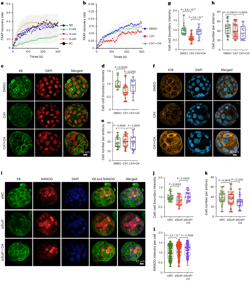 (a) FRAP 分析显示卵母细胞、二细胞、四细胞、八细胞和囊胚胚胎的细胞膜流动性。(b) FRAP 分析显示用 DMSO、CAY10566 或 CAY10566 加油酸处理的 3.5 dpc 囊胚胚胎的细胞膜流动性。(c)免疫荧光分析。 (d,e,g,h) 用 DMSO、CAY10566 或 CAY10566 加油酸处理的 4.5 dpc 囊胚胚胎的细胞-细胞边界荧光强度和每个胚胎的细胞数的量化。 (i)免疫荧光分析。 (j-l) 用 siNC、si Scd1或 si Scd1加油酸处理的 4.5 dpc 囊胚胚胎中细胞-细胞边界的荧光强度、每个胚胎的细胞和 NANOG 强度的量化。
