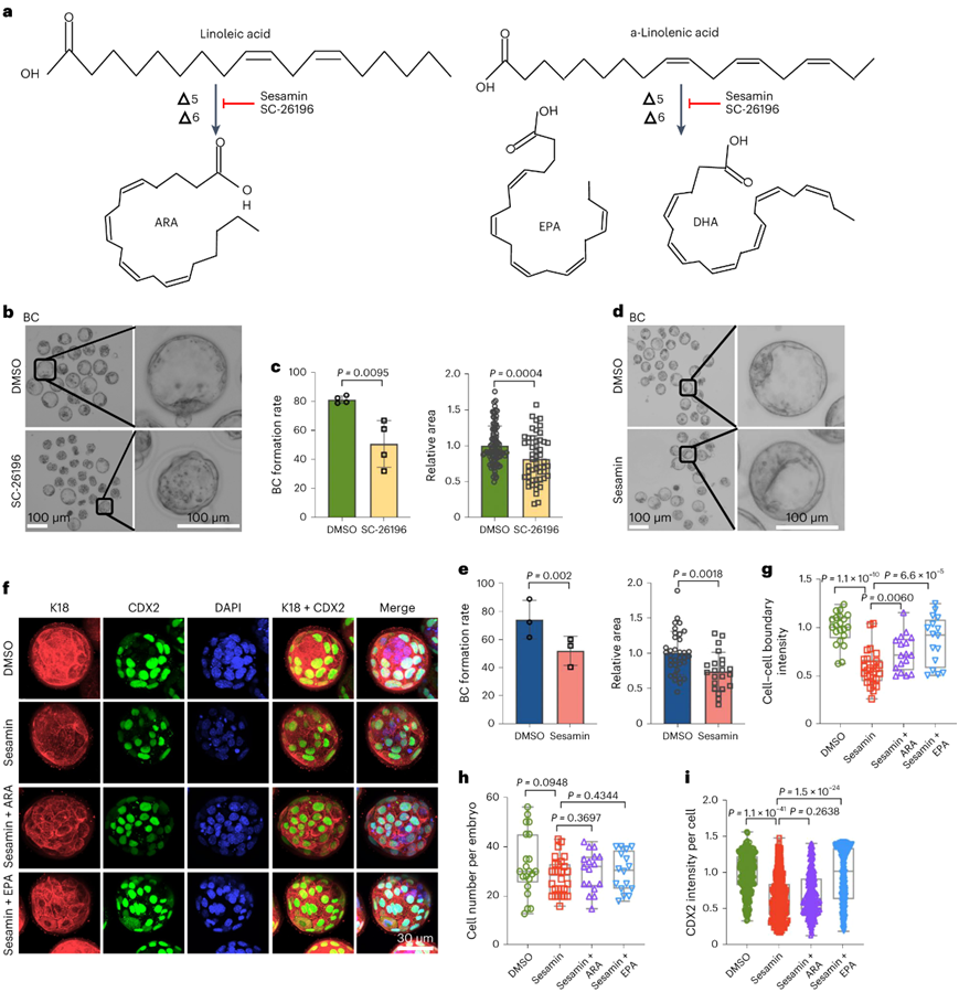 (a) 包括花生四烯酸 (ARA)、二十碳五烯酸 (EPA) 和二十二碳六烯酸 (DHA) 在内的 PUFA 由去饱和酶 Δ6 和 Δ5 合成,可由所示抑制剂抑制。(b)用 DMSO 或 100 nM Δ6 酶抑制剂 SC-26196 处理的 4.5 dpc 小鼠胚胎的代表性图像。(c) 用DMSO或SC-26196处理的囊胚胚胎在不含BSA的KSOM培养基中生长的囊胚形成率和腔面积。(d) 在 4.5 dpc 时用 DMSO 或 100 nM Δ5 酶抑制剂芝麻素处理的小鼠胚胎的代表性图像。(e) 用DMSO或芝麻素处理的囊胚胚胎在不含BSA的KSOM培养基中生长的囊胚形成率和腔面积。 (f)免疫荧光分析。(g-i) 用 DMSO、芝麻素、芝麻素+ ARA 或芝麻素+ EPA 处理的 4.5 dpc 囊胚胚胎中细胞-细胞边界的荧光强、每个胚胎的细胞数和 CDX2 强度的定量。
