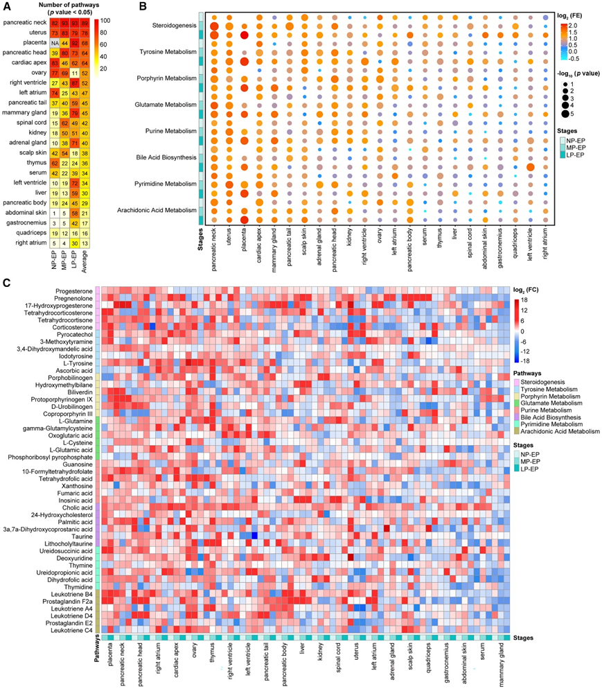 (A) 热图显示了 23 个组织中 NP、MP 和 LP 相对于 EP 显著变化的代谢途径数量。(B) 气泡图显示在 NP、EP、MP 和 LP 之间的所有转换中,一半或更多组织中显著变化的八种代谢途径。(C) 热图显示23 个组织中 NP、MP 和 LP 相对于 EP 的代谢物变化。