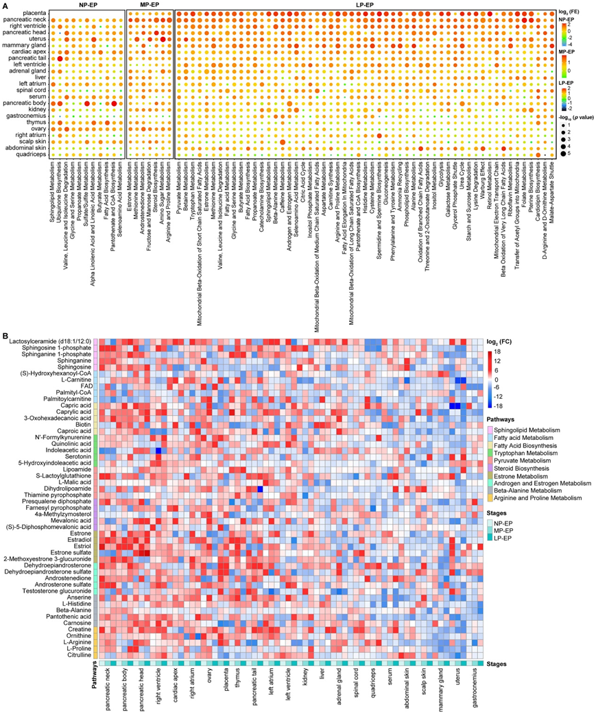 (A) 气泡图显示,在 NP、EP、MP 和 LP 之间的至少一种转变中,一半或更多组织的代谢途径发生显著变化。(B) 热图显示23 个组织中 NP、MP 和 LP 相对于 EP 的代谢物。