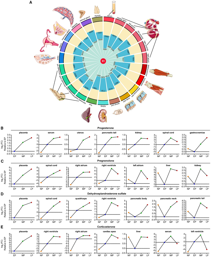 (A) 图表显示每个组织中 MP 和 LP 相对于 EP的差异代谢物数量。(B) NP、MP 和 LP 七个组织中黄体酮丰度。(C) NP、MP 和 LP 七个组织中孕烯醇酮丰度。(D) NP、MP 和 LP 七种组织中硫酸脱氢表雄酮丰度。(E) NP、MP 和 LP 七个组织中皮质酮丰度。