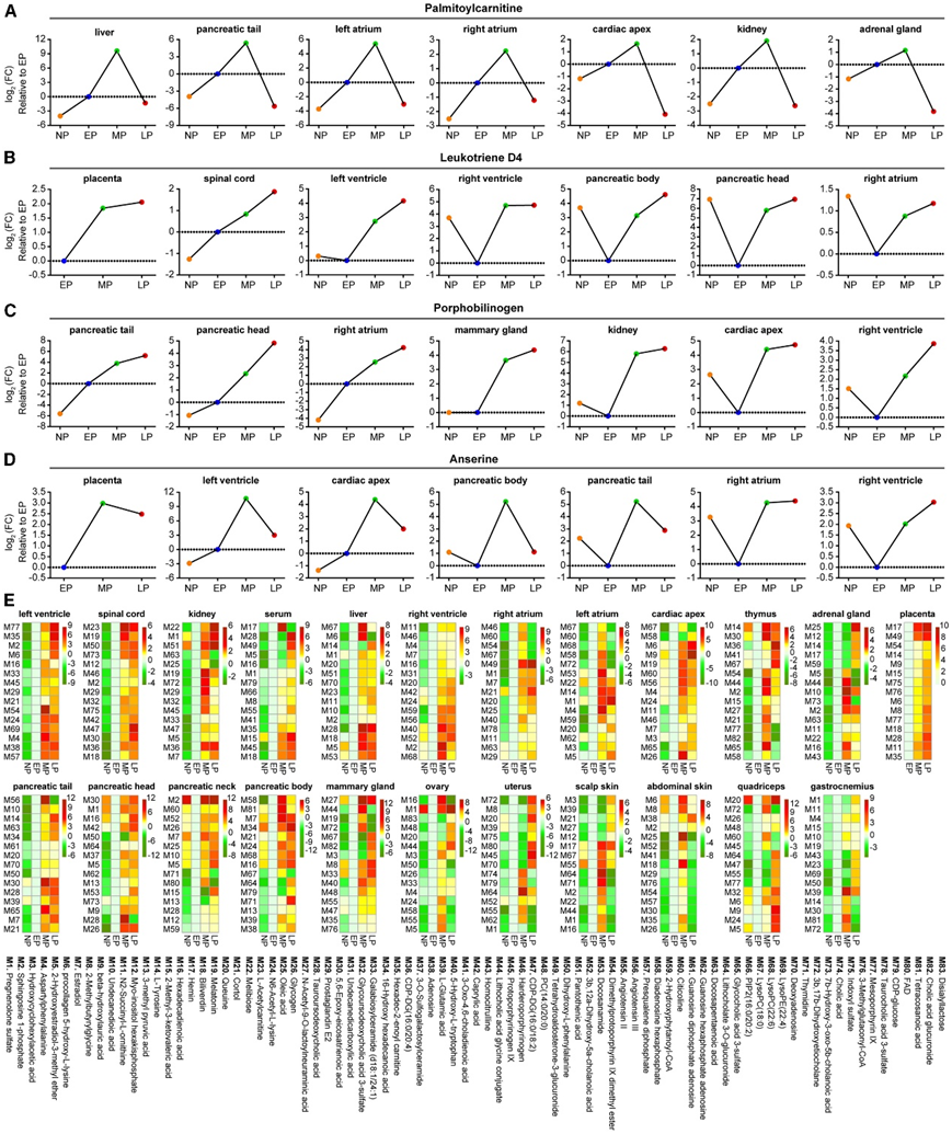 棕榈酰肉碱 (PC) 是众所周知的脂肪酸氧化中间体,与 NP 相比,EP 和 MP 期间肝脏、胰腺组织、心脏组织、肾脏、肾上腺、血清中的含量增加(图5A)。白三烯D4 (Leukotriene D4, LTD4)是花生四烯酸形成的炎症介质,MP和LP期间胎盘、卵巢、脊髓、心脏组织和胰腺组织中LTD4含量较EP升高,EP期间心尖、血清、胸腺、子宫、肝、肾和股四头肌中LTD4含量较NP升高(图5B)。胆色素原是细胞色素和过氧化氢酶中血红素基团的前体,在怀孕期间在多个组织中增加,这些组织包括胰腺组织、心脏组织、乳腺、肾脏、肾上腺、头皮皮肤和卵巢(图5C)。鹅氨酸是β -丙氨酸代谢的产物,具有细胞保护功能,可在肾脏代谢,在胎盘、心脏组织、胰腺组织、卵巢、血清、头皮皮肤、脊髓和胸腺中呈不同阶段的增加(图5D)。