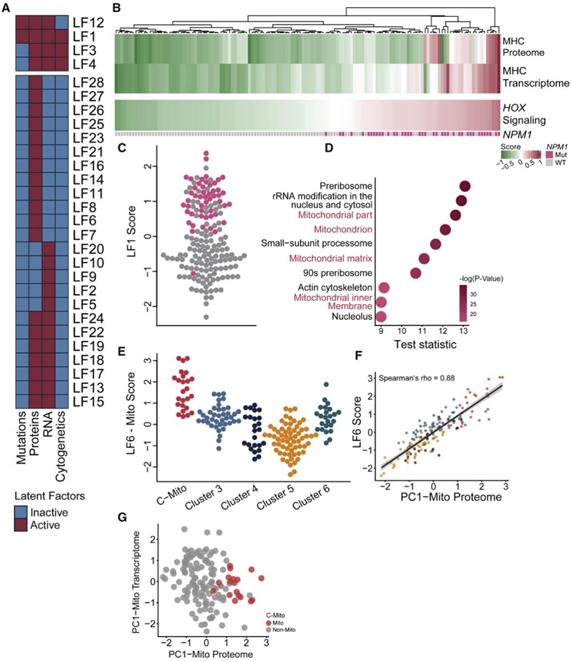 (A) 28 个因素驱动所有数据层的变化。(B) LF1- NPM1/HOX的患者特异性富集评分,其中每条线对应于一名患者,颜色编码路径和患者特异性标准化富集评分。(C) LF1- NPM1/HOX评分按NPM1突变状态进行颜色编码。(D) LF6-Mito 因子权重的通路分析表明 LF6-Mito 富含与线粒体过程相关的通路。(E) 显示每个蛋白质组聚类的 LF6-Mito 分数;LF6-Mito 评分很大程度上将分配至 C-Mito 和 C5 的患者分开。(F) 每个患者的 LF6-Mito 评分(y 轴)与线粒体蛋白质组的第一个 PC(x 轴)的散点图。(G) 仅注释线粒体的基因的蛋白质组和转录组的主成分分析(PCA)。