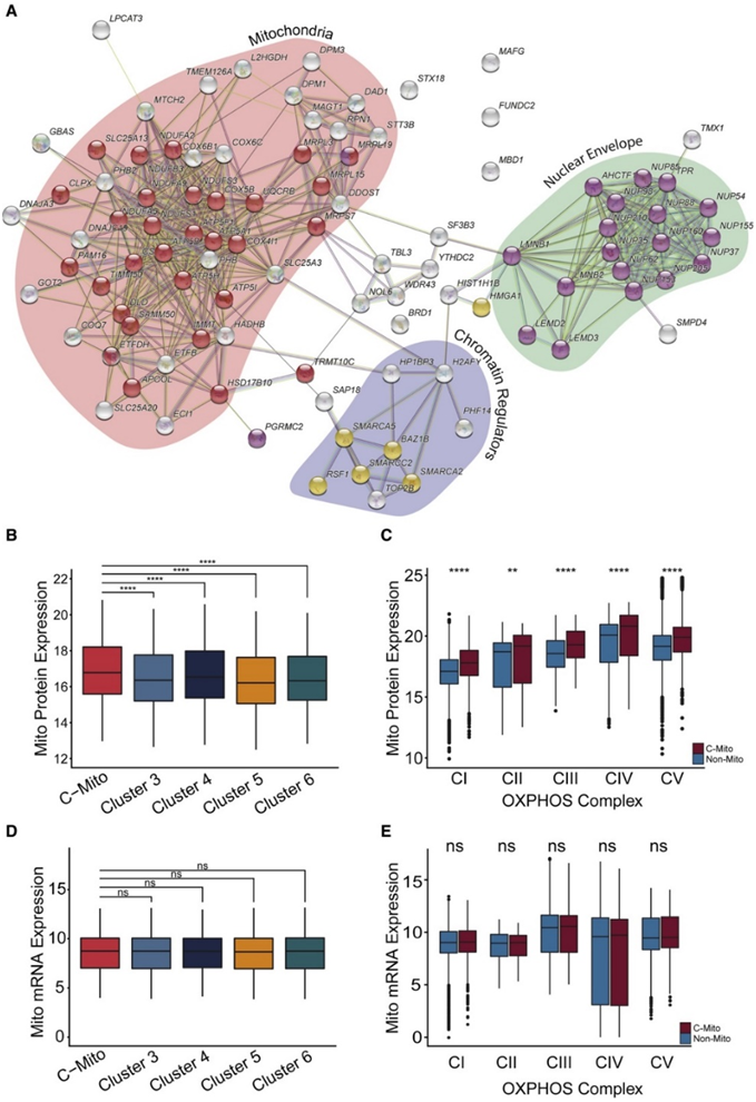 为了进一步了解 C-Mito 的生物学特性,他们提取了在将 C-Mito 与所有其他蛋白质组聚类进行比较时表现出显著表达差异的前 100 个蛋白质。这些蛋白质大多数属于三个生物类别之一,即线粒体、核膜和染色质调节因子(图 5 A)。通过叠加先前发表的蛋白质相互作用以获得表征 C-Mito 的蛋白质相互作用网络,揭示了这些蛋白质的强互连性。对于线粒体,C-Mito 的特点是几乎所有线粒体蛋白都高表达,包括呼吸复合物 I-V,根据本项研究的 MOFA 分析,这种现象仅在蛋白水平而非 RNA 水平上观察到(图 5B-E)。
