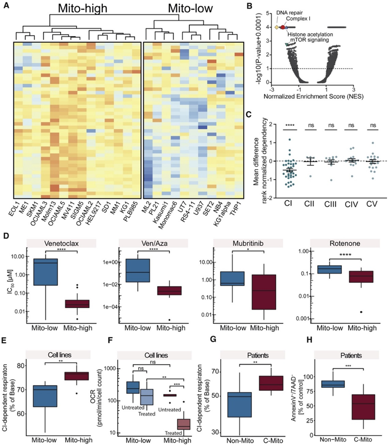 (A) 基于 45 种 OXPHOS 相关蛋白表达的急性白血病细胞系的层次聚类。(B) 火山图描绘了 CRISPR (Avana) 21Q2 数据中可用的 Mito-high 与 Mito-low 细胞系中全基因组差异 CERES 依赖性评分的基因集富集。(C) 散点平均值 ± SD 点图描绘了 OXPHOS 复合物 I-V 中 Mito-high 与 Mito-low 细胞系的平均差异等级归一化 CERES 依赖性评分。(D)显示了 Mito-high AML 细胞系和 Mito-low AML 细胞系的半数抑制浓度 (IC50)。 (E) 使用 Seahorse 96 细胞外通量分析仪对 AML 细胞系中的呼吸链复合物 I 依赖性进行定量。(F) 用 2 μM venetoclax 处理 24 小时后测量的细胞系耗氧率。(G) 使用 Seahorse 96 细胞外通量分析仪对主要患者样本中的复合物 I 依赖性进行量化。(H)Annexin V−/7AAD− 的量化。