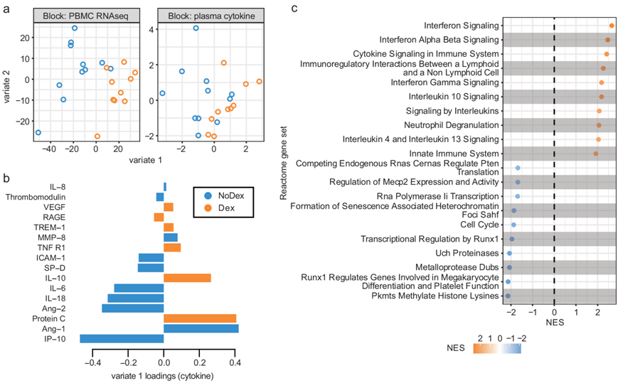 (a) 使用 DIABLO 对比较 Dex 和 NoDex 的患者的血浆细胞因子(17 种细胞因子变量)和PBMC RNA-seq(500 个基因变量)数据(配对)进行综合分析。(b) 细胞因子对 DIABLO 变量 1 的贡献。(c) 基因集富集分析。