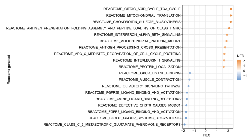 然后,他们比较了 Dex和 NoDex组之间的外周血基因表达,发现了 4050 个差异表达基因(DEG)(图 1d)。参与 T 细胞共刺激的免疫基因(例如TNFRSF4)和参与 T-/B- 和 NK 细胞活化的IL21R,以及参与过敏反应的几个基因(MS4A2,PTGDR2)在 Dex 患者中下调。在 Dex 患者中上调的基因包括ADAMTS2,一种由 TGF-β 上调的前胶原 N-内切肽酶,据报道由糖皮质激素上调,以及RLN3,参与对 DNA 损伤和修复的反应。基因集富集分析 (GSEA) 确定了 21 条显著失调的通路(图 S3),Dex 患者中最富集的通路包括三羧酸循环和几种线粒体相关通路、防御病原体和干扰素信号传导。相反,NoDex 患者的基因表达特征与感觉转导通路的富集一致,可能与白细胞群体的差异有关,以及与成纤维细胞生长因子受体 (FGFR) 和 G 蛋白偶联受体 (GPCR) 等细胞存活相关通路的激活有关。