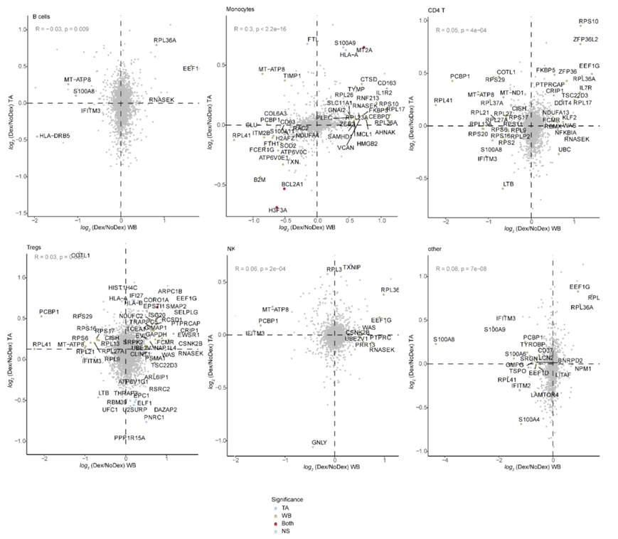图4. 地塞米松对肺和外周血中细胞类型特异性基因表达具有不一致的影响。
