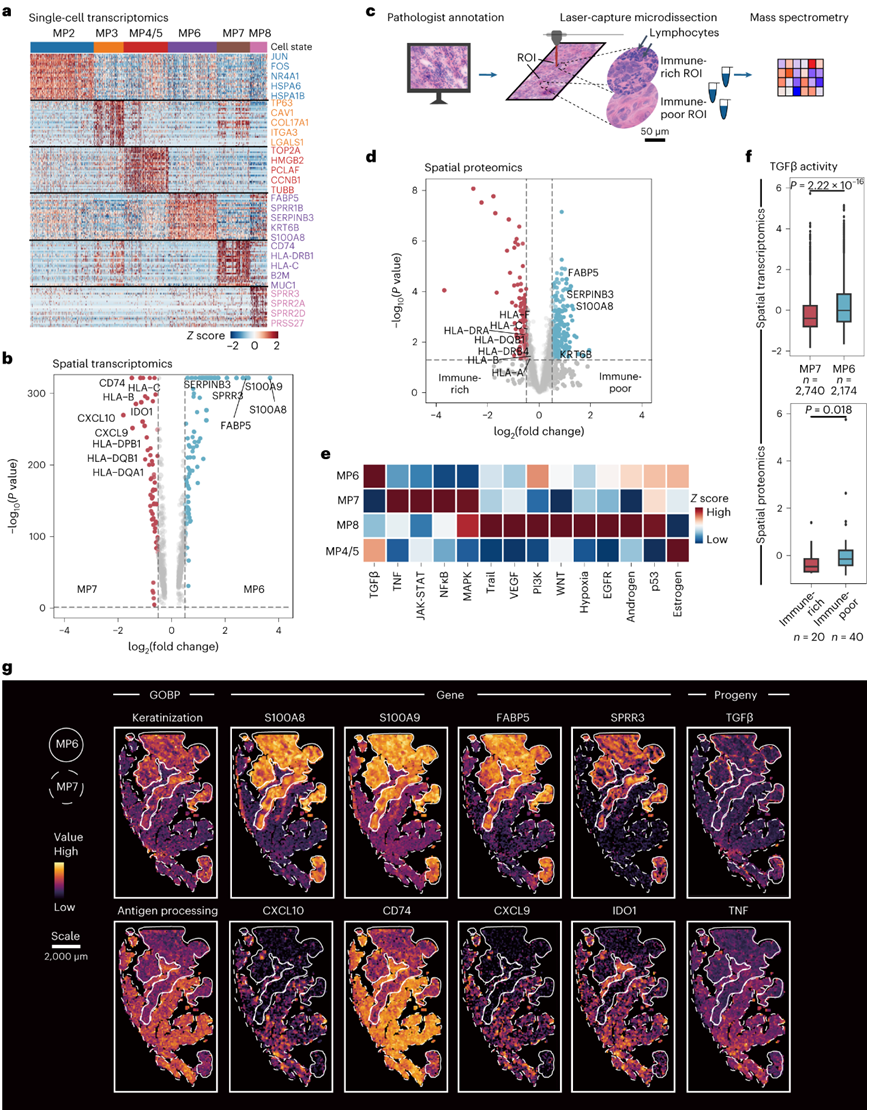 为了确定 RNA 水平升高是否会导致蛋白质的一致增加,他们对具有不同程度 TIL 的空间定义的肿瘤感兴趣区域 (ROI) 应用了高灵敏度质谱 (MS)。通过激光捕获显微切割 (LCM) 分离出60 个空间不同的 ROI,包括 20 个免疫丰富的 ROI 和 40 个免疫较差的 ROI,用于蛋白质组学分析。他们在所有 ROI 中,对超过 2194 种蛋白质进行了定量(图4c)。MP6特异性基因,如FABP5、SERPINB3、KRT6B和S100A8,在免疫不良的ROI中较高,与转录组数据一致(图4d)。此外,尽管在空间蛋白质组学数据中仅检测到 25 个 MP7 特异性蛋白中的 3 个,但 B2M 和多个 MHC 分子在免疫丰富的 ROI 中升高(图4d)。PROGENy 的通路活性评估显示转化生长因子β(TGFβ)通路在MP6细胞中升高(图4e)。对空间转录组和蛋白质组数据的 PROGENy 分析表明 MP6 斑点和免疫不良 ROI 中的 TGFβ 信号传导持续增强(图4f-g)。值得注意的是,PROGENy TGFβ信号优先位于MP6肿瘤区域的外围(图4g),表明TGFβ途径可以改变肿瘤周围的微环境,例如CAF和免疫细胞。