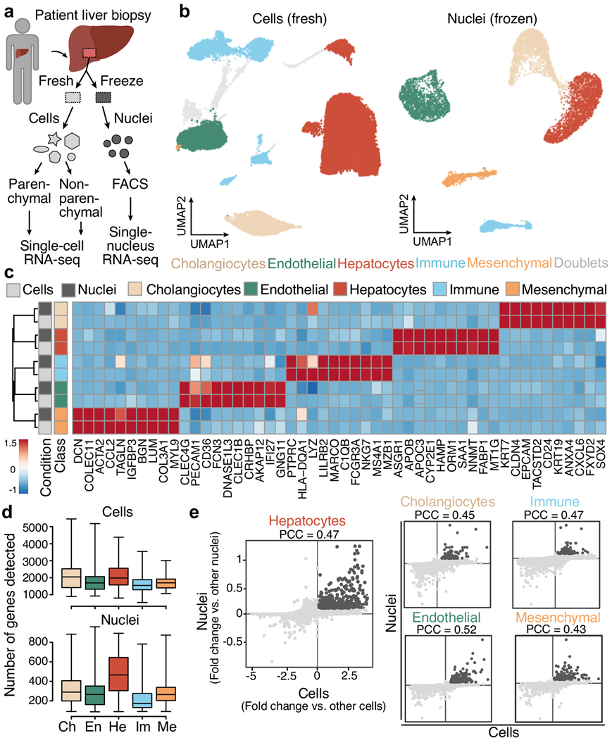 (a) scRNA-seq 和snRNA-seq实验示意图。(b) UMAP 可视化。(c) 每种主要细胞类型的标记基因的表达。(d) 主要细胞类型中每个细胞和细胞核检测到的基因数量。(e) 显示了新鲜和冷冻样本中每种主要细胞类型的标记基因检测比较。