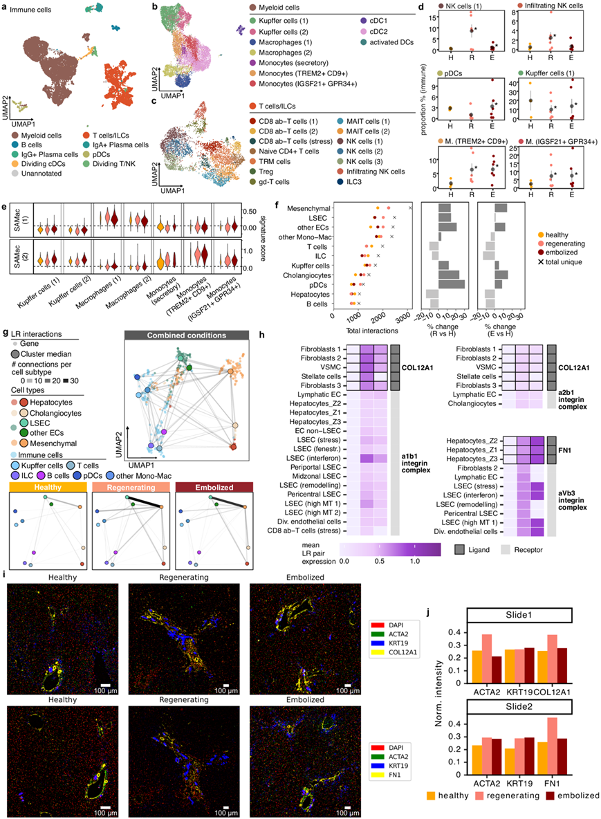 (a-c)UMAP可视化。 (d) 选定的免疫细胞群的比例变化。(e) 每种情况下髓系细胞群中的疤痕相关巨噬细胞 (SAMac) 特征评分。(f) 细胞间相互作用分析。(g) UMAP图显示特定的配体-受体相互作用网络。(h) 热图显示在健康、再生和栓塞后涉及 ECM 蛋白的选定配体-受体对的平均表达。(i) 免疫组织化学染色分析。(j) 三种蛋白质的总荧光强度分析。