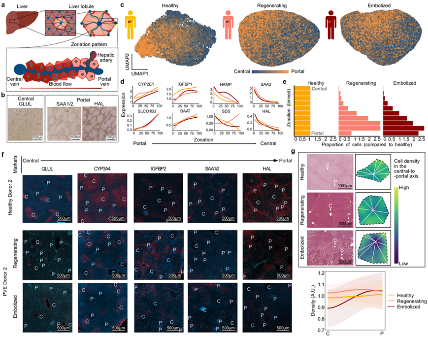 (a) 示意图说明肝小叶的结构。(b) 健康组织肝细胞内中央和门脉区域特异性蛋白表达的 3,3'-二氨基联苯胺 (DAB) 染色。(c) 健康(右)、再生(中)和栓塞(左)组织肝细胞内分区的基因表达特征。(d)代表性分区标记基因的表达模式。(e) 直方图显示分区中肝细胞的比例。(f) 肝组织各种肝细胞分区标记的免疫荧光染色分析。(g) H&E染色和细胞平均密度分析。