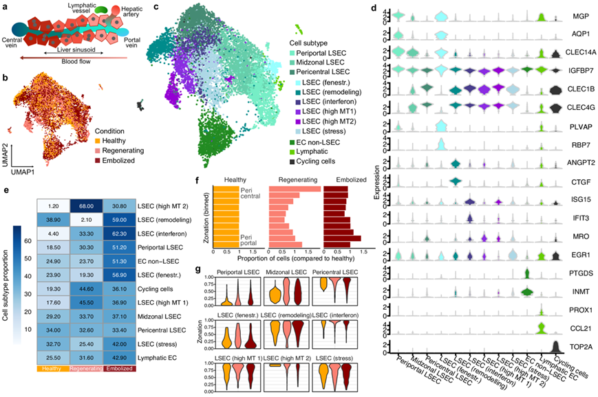 (a) 示意图说明了肝小叶内沿门脉中心轴的内皮细胞多样性。(b-c) UMAP可视化。(d) 小提琴图显示内皮细胞亚群标准化标记基因表达的分布。(e)每种内皮细胞亚群的比例。(f) 直方图显示LSEC(门脉周围、中间区域和中心周围 LSEC)分区的比较。(g) 显示了健康、再生和栓塞后每个 LSEC 亚群沿分区轨迹的分布。