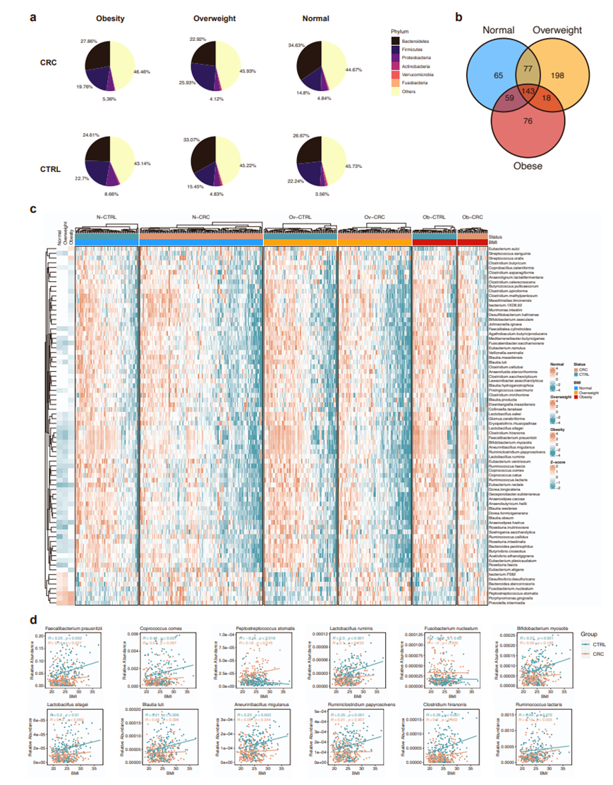 (A)饼状图显示了不同BMI组CRC和CTRL在门水平上的微生物组成。(B)维恩图显示正常体重组、超重组和肥胖组差异种数。(C)已鉴定的差异细菌物种相对丰度热图。(D) CRC和CTRL区12种差异细菌物种相对丰度和BMI的散点图和线性拟合。