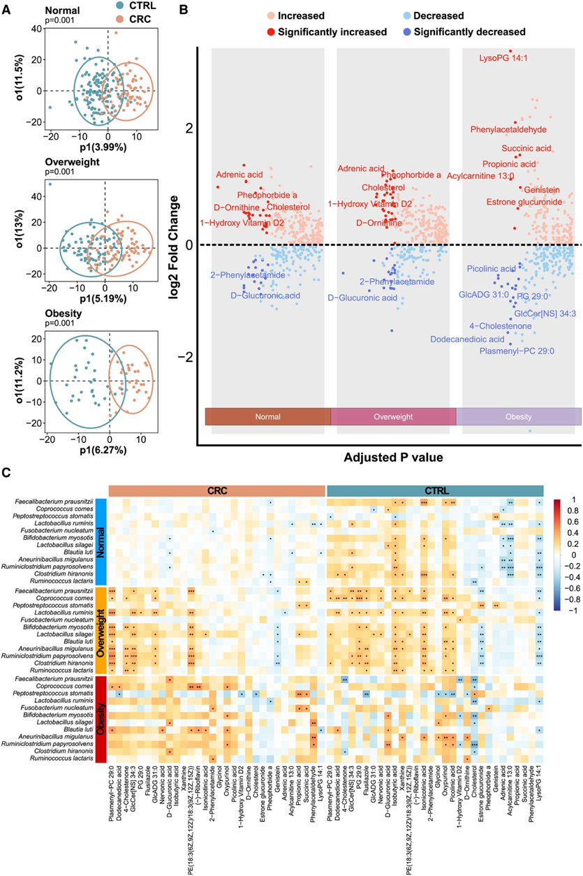 (A) 每组 CRC 患者和健康对照代谢物的正交偏最小二乘判别分析 (OPLS-DA)。(B) 每组差异代谢物的火山图。(C) 正常体重、超重和肥胖组的 CRC 和 CTRL 中差异物种和代谢物之间的 Spearman 相关性。