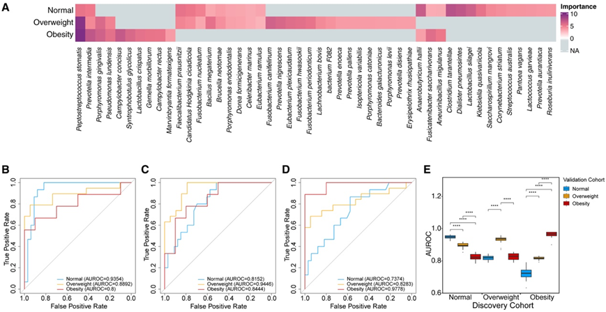 (A) 发现队列中每个 BMI 组中选定微生物特征重要性的热图。(B) 由发现队列的 N-CRC 和 N-CTRL 构建的模型在验证队列的正常组、超重组和肥胖组中进行验证,并计算 AUROC 值。(C) 该模型是根据发现队列的 Ov-CRC 和 Ov-CTRL 构建的,并在验证队列的三组中的每一组中进行验证。(D) 该模型是根据发现队列的 Ob-CRC 和 Ob-CTRL 构建的,并在验证队列的三组中的每一组中进行验证。(E) 箱线图显示了使用 (A) 中选定特征的模型的组间验证的 AUROC 值。