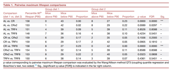 与 AL 对照组相比,CR 和 CRx2 方案处理的中年雌性小鼠的最大生存期显著增加(图 3 A)。将所有数据合并后,中位寿命的变化为3.2%。90%小鼠死亡年龄的平均增幅仅为2%(表1)。通过该试验,CR和CRx2与AL小鼠以及CR与TRF8小鼠相比,最大寿命显著增加。因此,CR和CRx2方案使雌性小鼠的寿命得到了小幅但显著的延长,并对其晚年产生了影响。