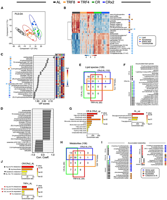使用四向维恩图,他们通过人类代谢组数据库(HMDB)标识符鉴定了四种喂养方案与 AL 之间的共有或唯一的脂质种类。在TRF4-AL或TRF8-AL配对比较中均未发现脂质类型,或者TRF4和TRF8 与 AL组之间没有共享的脂质类型,而CR-AL、CRx2-AL以及CR和CRx2 组与AL组的配对比较中分别发现了10、1和16个脂质分子的积累(图4E),且具有统计学意义(图4F)。将这27种代谢物(10 + 1 + 16)作为MetaboAnalyst(5.0版)的富集分析模块的输入数据,在CR和CRx2组(例如胆汁酸、脂肪酸酰基肉碱、二羧酸)和AL组(例如单酰基甘油、甘油磷脂)之间检测到显著差异(图4G)。然后使用相同的方法确定了4种喂养方案与AL相比具有共有或唯一的代谢物(脂质除外)(图4H-I)。CR(2/7)、CRx2(2/3)或CR和CRx2(3/13)与AL相比,对独特代谢物丰度的影响不大,而在TRF4和AL的比较中,超过7种代谢物独特富集,而TRF4和TRF8与AL相比有1种代谢物共同富集 (图4I)。化学修饰的氨基酸,包括甲基化、乙酰化和羟基化,占较大比例。富集分析表明,与CR组和CRx2组相比,AL组的Arg和Pro、谷胱甘肽以及Gly、Ser、Thr代谢相关的通路占优势,而TRF4组中与Arg和Pro、Trp代谢以及Val、Leu和Ile的生物合成/降解相关的通路的富集(图4J)。这些结果表明,CR组的血清代谢组学特征与TRF组不同。