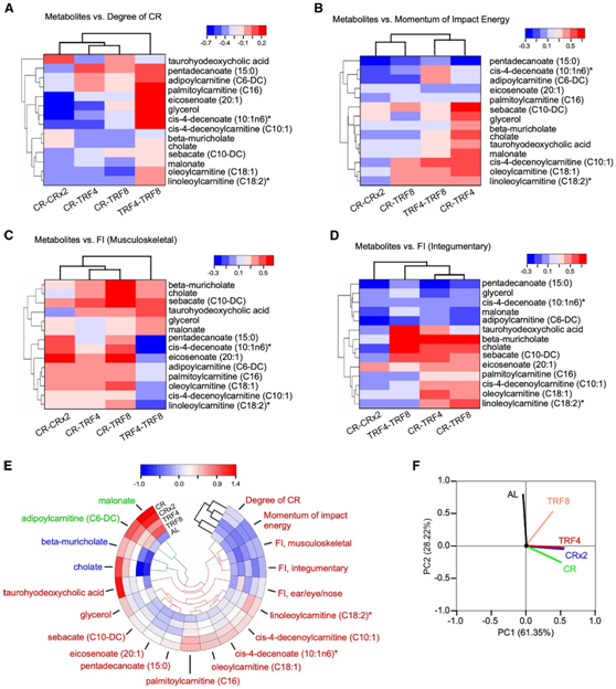 (A-D)在每组营养干预中,14种代谢物显著变化的分层聚类相关系数与CR程度、动量冲击能量和虚弱指数(FI)成分(如肌肉骨骼和外皮)的热图。(E) 用圆形树状图描绘层次聚类的极坐标热图。(F)基于 5 个实验组的平均值的Z评分归一化生理和血清代谢组学数据的主成分分析 (PCA) 。