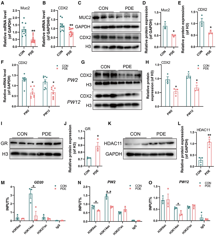 (A-B) GD20 时Muc2和CDX2的 mRNA 表达。(C–E) 使用 ImageJ 分析 GD20 时 Muc2 和 CDX2 的蛋白质水平。(F) PW2 和 PW12 时的CDX2 mRNA 水平。(G-H) PW2 和 PW12 时细胞核中 CDX2 蛋白水平。 (I-J) GD20 时细胞核中的 GR 蛋白水平。(K-L) GD20 时的 HDAC11 蛋白水平。(M-O) GD20、PW2 和 PW12 时 CDX2 启动子区域中的 H3K14ac、H3K9ac 和 H3K27ac 水平。