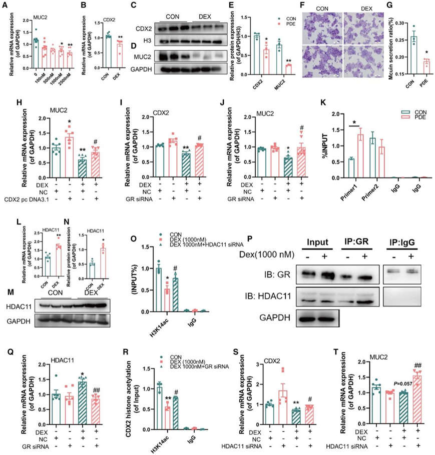 (A)不同浓度地塞米松处理后LS174T细胞中MUC2 mRNA的表达。(B) CDX2 mRNA 表达。(C-E) 使用 ImageJ 分析 CDX2 和 MUC2 蛋白水平。(F-G)LS174T细胞的PAS染色,使用ImageJ分析粘蛋白分泌率。(H)用地塞米松(DEX)处理或用DEX+NC/CDX2 pc DNA3.1共同处理的LS174T细胞的MUC2 mRNA表达。(I-J)用DEX处理或用DEX+NC/GR siRNA共同处理的LS174T细胞的CDX2和MUC2 mRNA表达。(K) 通过 CHIP 将 GR 蛋白与 CDX2 启动子区域中推定的 GR 结合位点特异性结合。(L-N) HDAC11 mRNA 和蛋白质水平。(O)用DEX处理或用DEX+NC/HDAC11 siRNA共同处理的LS174T细胞的CDX2启动子区域中的H3K14ac水平。(P)通过coIP分析GR和HDAC11之间的相互作用。(Q-R)用 DEX 处理或用 DEX+NC/GR siRNA 共同处理的 HDAC11 表达和 H3K14ac 水平。(S-T)用DEX处理或用DEX+NC/HDAC11 siRNA共同处理的CDX2和MUC2表达。