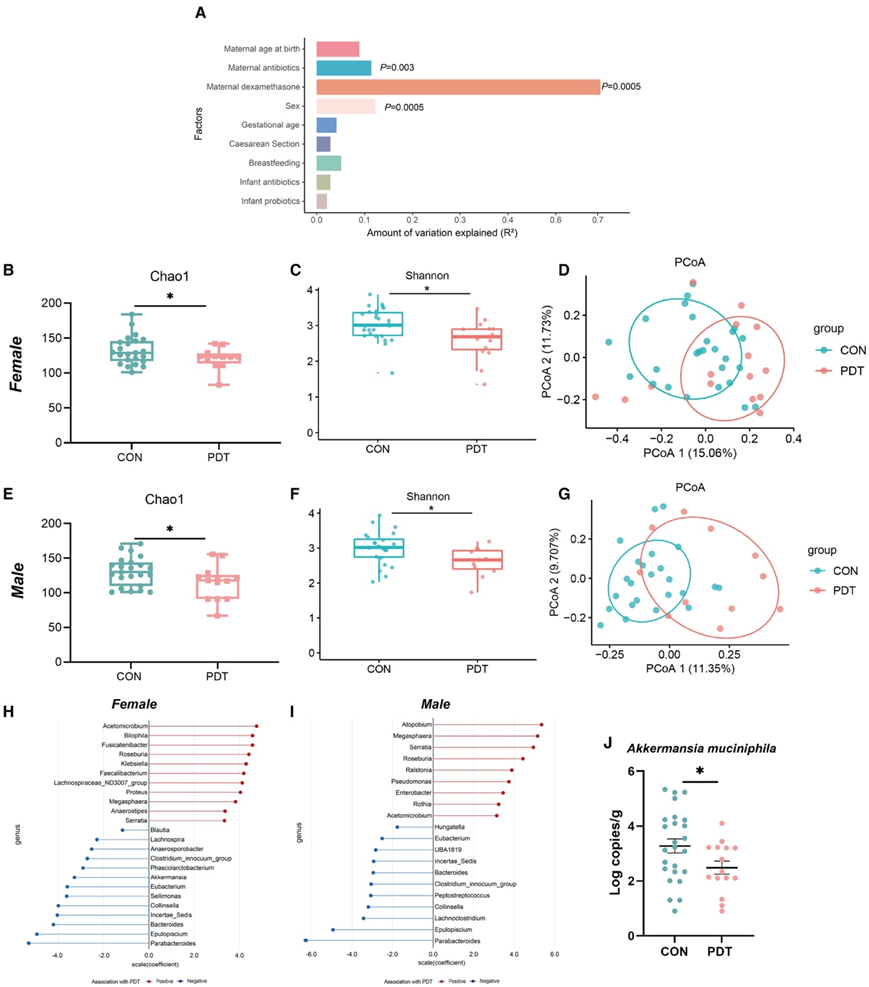 接下来,他们比较了PDT组和CON组之间的肠道微生物群特征。分别对男婴和女婴的数据进行分析。与对照(CON)组相比,PDT组男女婴儿肠道菌群Chao1指数和Shannon指数均显著降低(图1B-F)。女婴和男婴肠道菌群的群落结构在PDT组和CON组之间也存在显著差异)(图1G)。在PDT女性组中,13个细菌属(包括Akkermansia, Bacteroides和Parabacteroides)的相对丰度降低,而11个细菌属(包括Klebsiella)的相对丰度增加(图1H)。在PDT男性组,Parabacteroides、Lachnoclostridium、拟杆菌属等8个细菌属减少,而9个细菌属(包括Atopobium)增加(图1L)。通过实时qPCR进一步证实了女婴中pdt相关的A. muciniphila减少(图1J)。